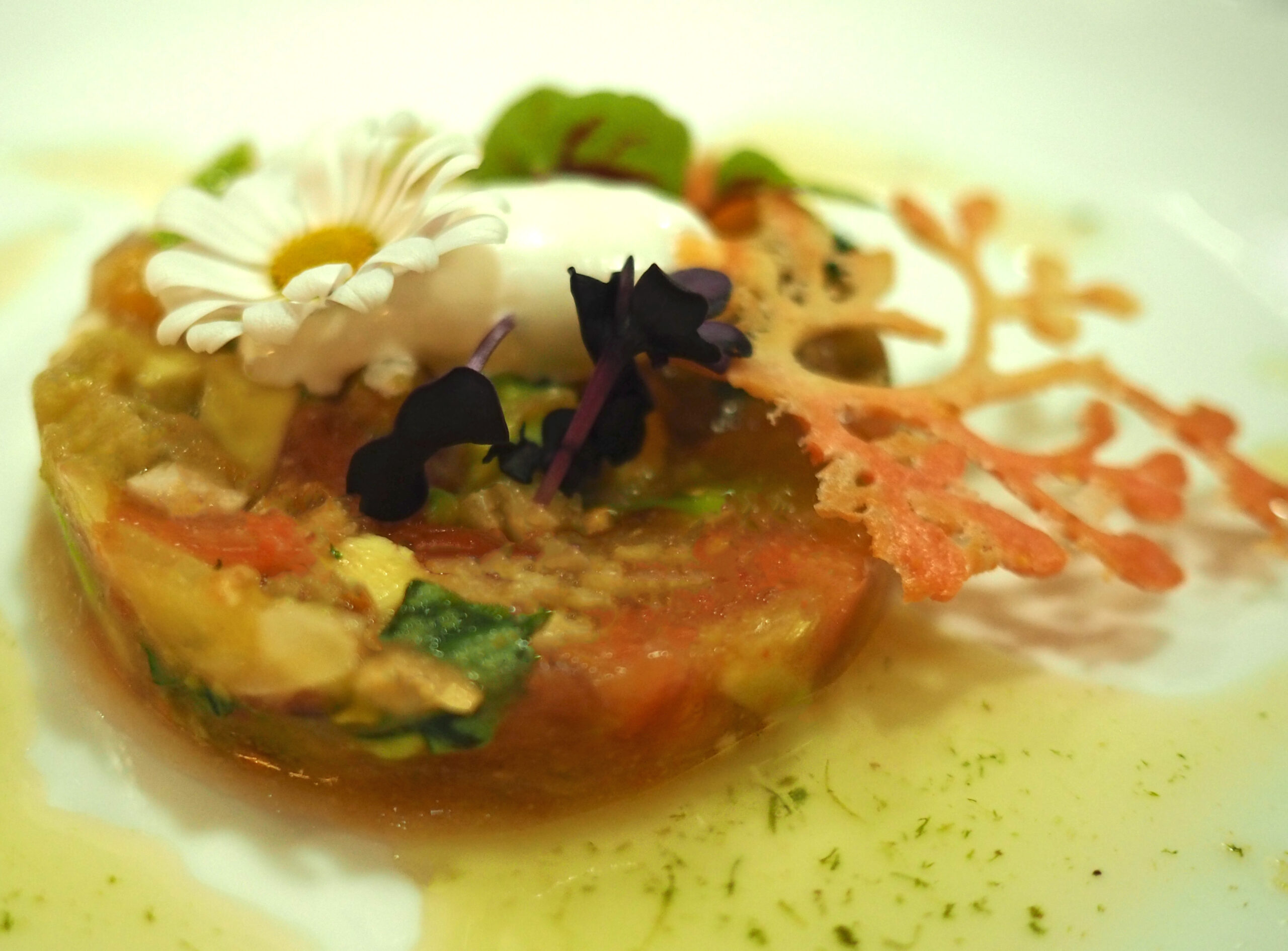 Schik hierop een takje kervel, wat cress en bloemblaadjes.