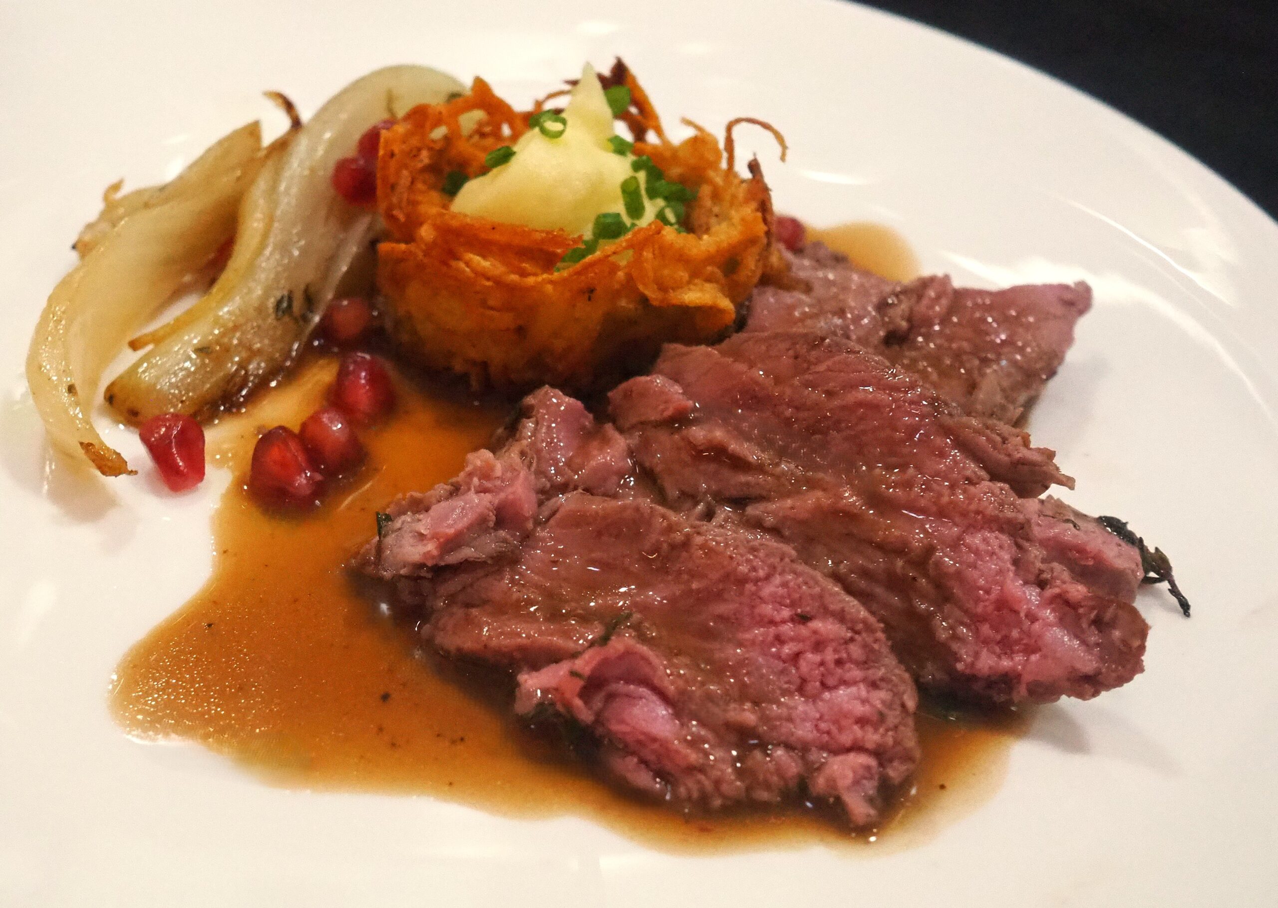 Leg het vlees erop. Versier met granaatappelpitjes.
