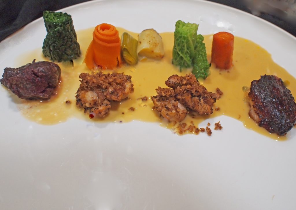 Maak de bladeren los van de kool en snij de nerf eruit. Blancheer de bladeren kort en doe direct over in ijswater. Dep droog en smeer de bladeren in met een beetje boter. Rol strak op in rolletjes en leg op de plaatje. Leg op een plaat en houd warm in de warmhoudkast. Snij de rollen in cilinders van 2-3 cm.