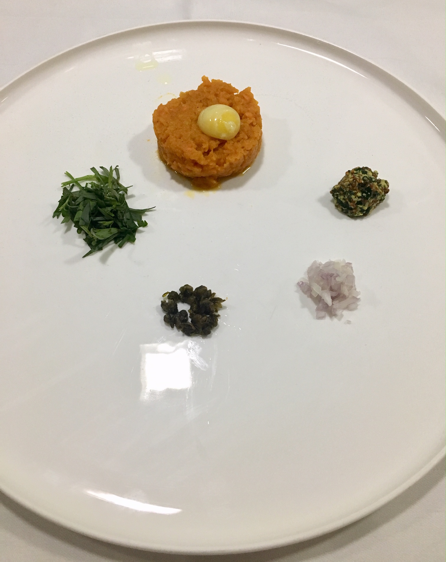 Maak de worteltartaar aan met wortelpuree en breng op smaak met zout en peper. Verdeel de tartaar in ringen over de borden. Leg een kwarteldooier op de tartaar. Maak hoopjes van de smaakmakers rondom de tartaar.